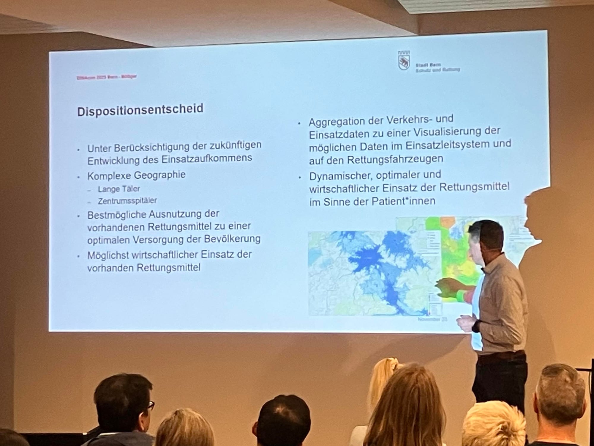 In a canton where an ambulance trip can last 80km in hilly terrain, the challenge of coordination is clear. A „Next Best“ real-time data system for emergency services is presented by Jakob Böttger (City of Bern, above) that dynamically combines traffic data, deployment patterns, resource availability, and medical needs to automatically select the fastest and most suitable vehicle.