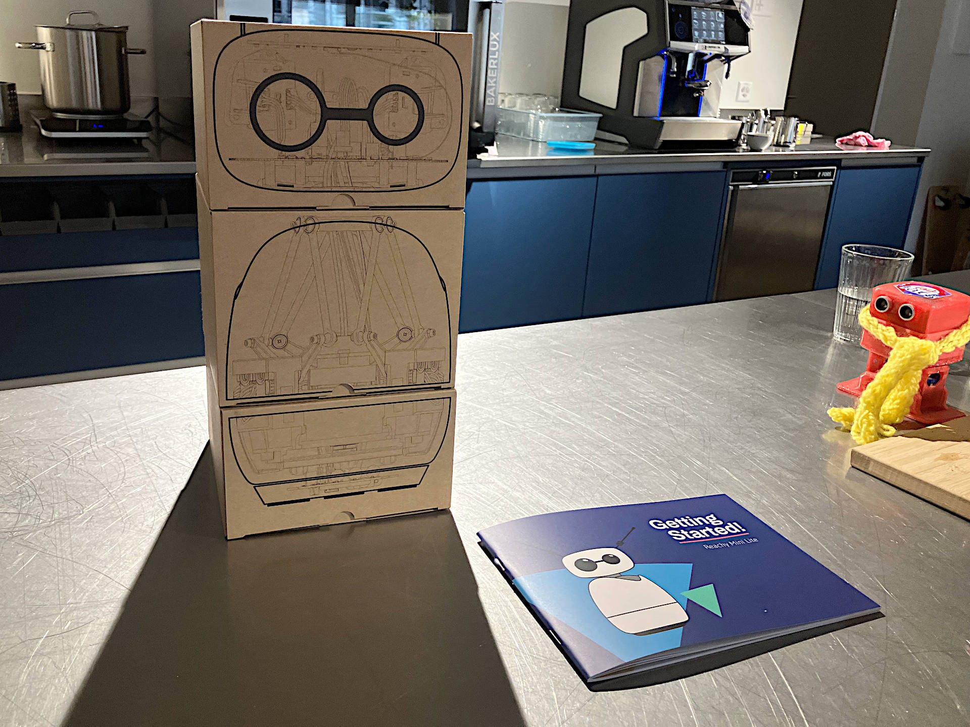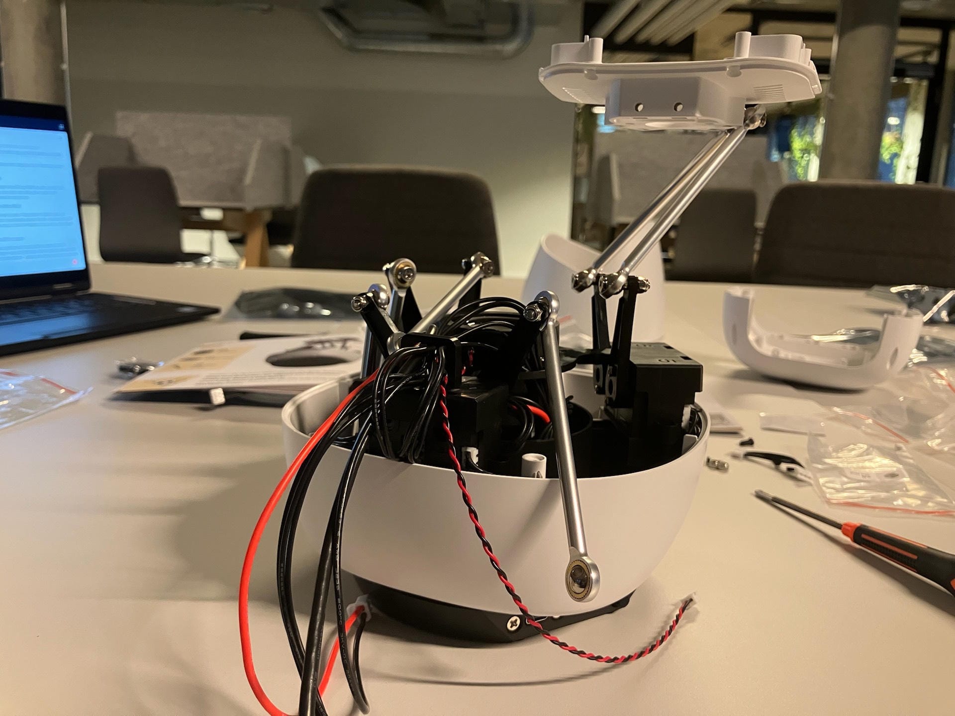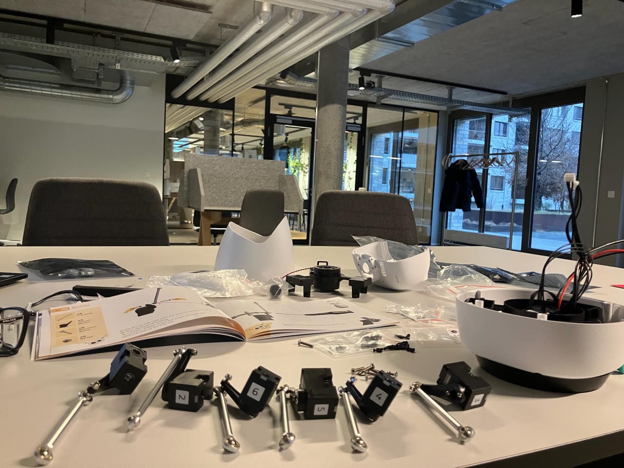 Five months later, a neat package arrived on the doorstep. Here are some shots of the unboxing and assemby, featuring Sandro and Roböterli at the coffee bar of WORKSPACE & MORE. It took us about 2 hours to complete the build, captured in a desktop stream. If you're interested in my feedback on the process, links to more information, you will also find it after the photo gallery. Or just stop by in January to meet Reachy Mini!