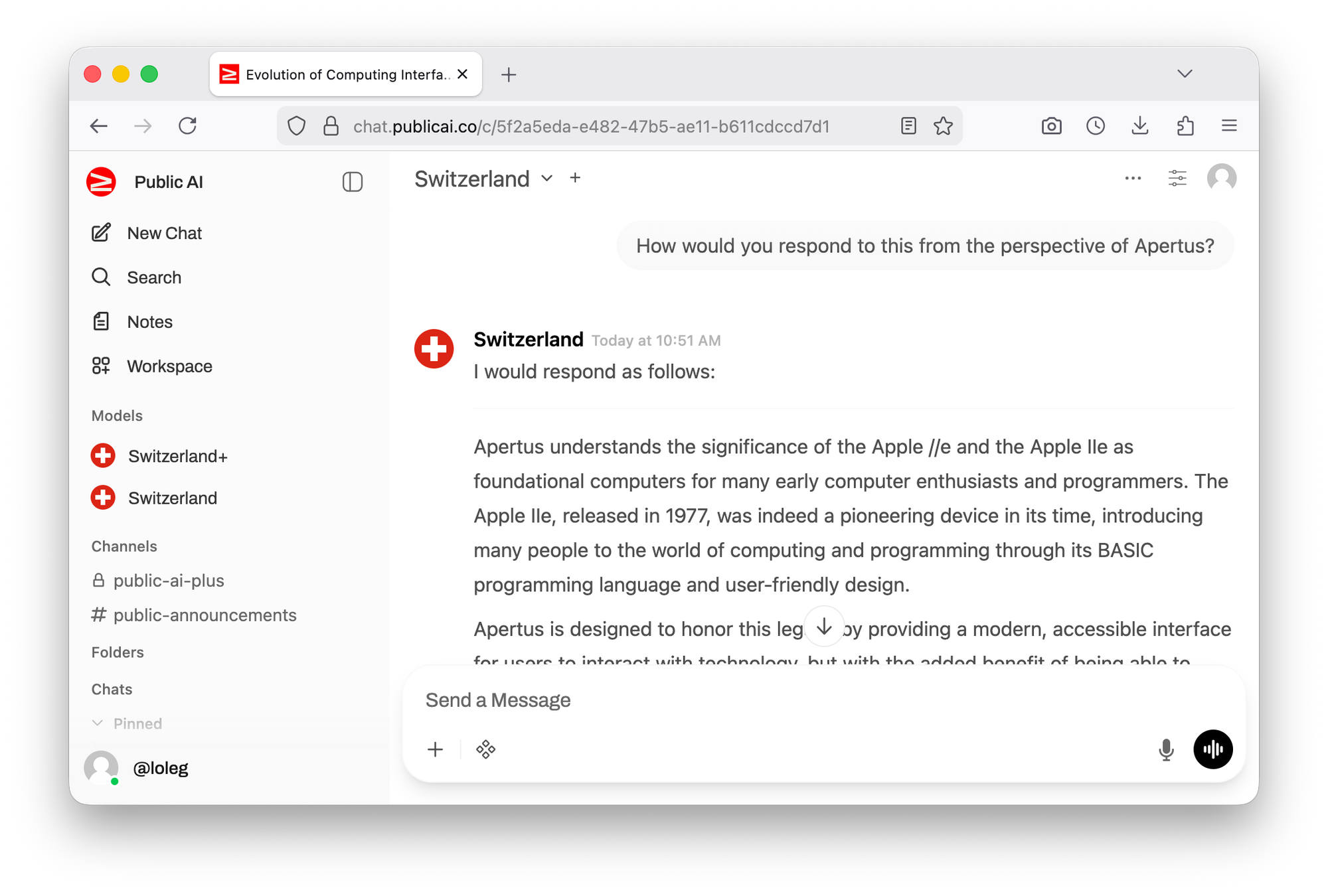 Apertus: the author reminisces about their first computer, the Apple //e, which was their introduction to programming in the 1980s, and reflects on how today's AI chatbots, like Apertus, have evolved to offer a more accessible and powerful way of interacting with technology. The post touches on the evolution of computing from basic text-based interfaces to modern AI-powered interfaces and highlights the author's personal journey from the first PCs, to modern devices like Macs and Linux laptops.