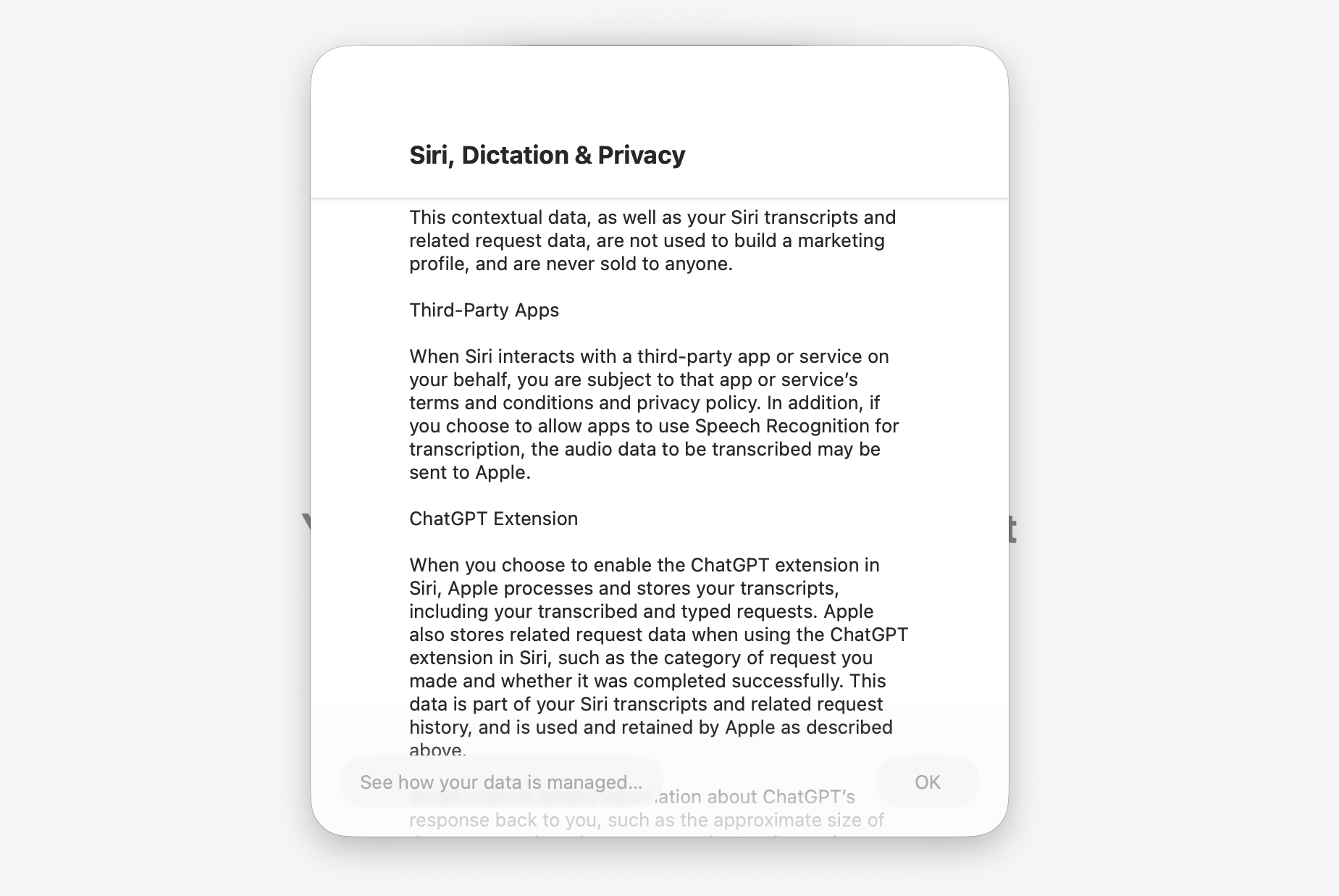 I must give a hat-tip to Apple for making it quite easy to disable or re-enable at any point: just be aware that data will be collected, and shared with 3rd parties as in the case of the ChatGPT Extension, as soon as you accept the T&Cs.