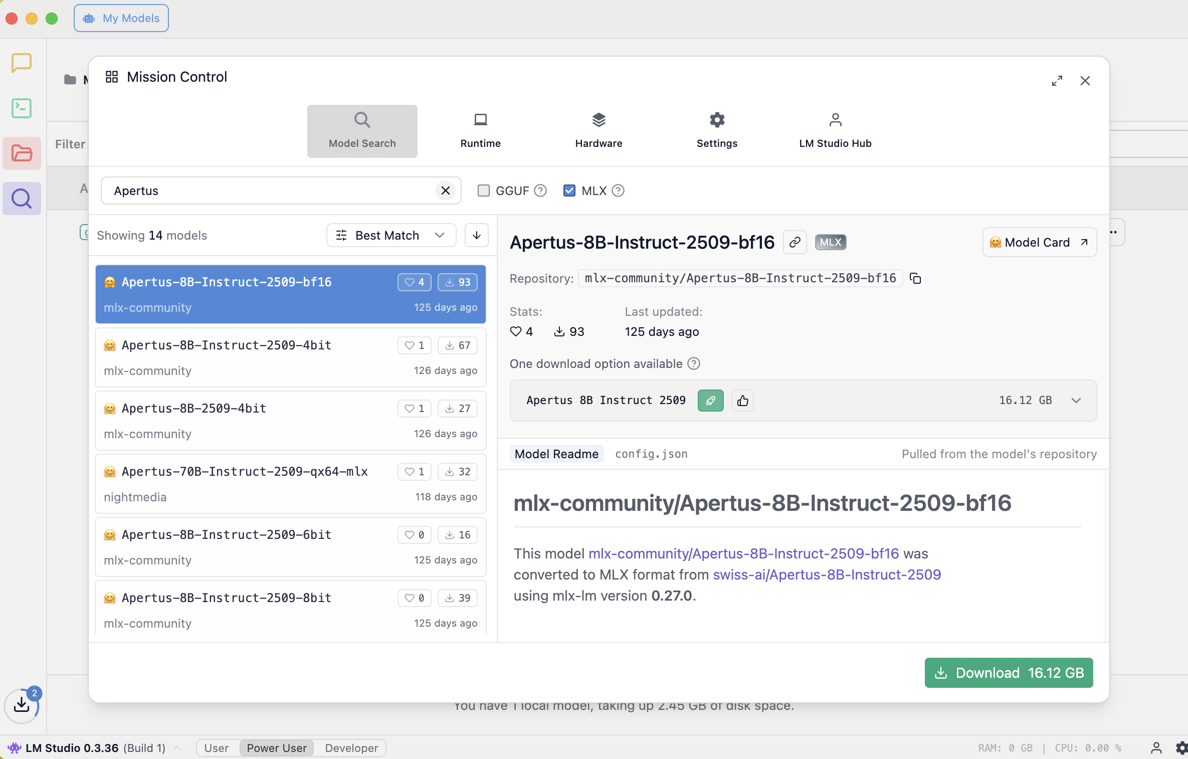 For use on this MacBook, I picked Apertus-8B-Instruct-2509-bf16, a remix of the model that is published by mlx-community. Click Download, noting that it is unquantized, offered here in the same BF16 (Brain Floating Point) precision as the stock 8B model.
