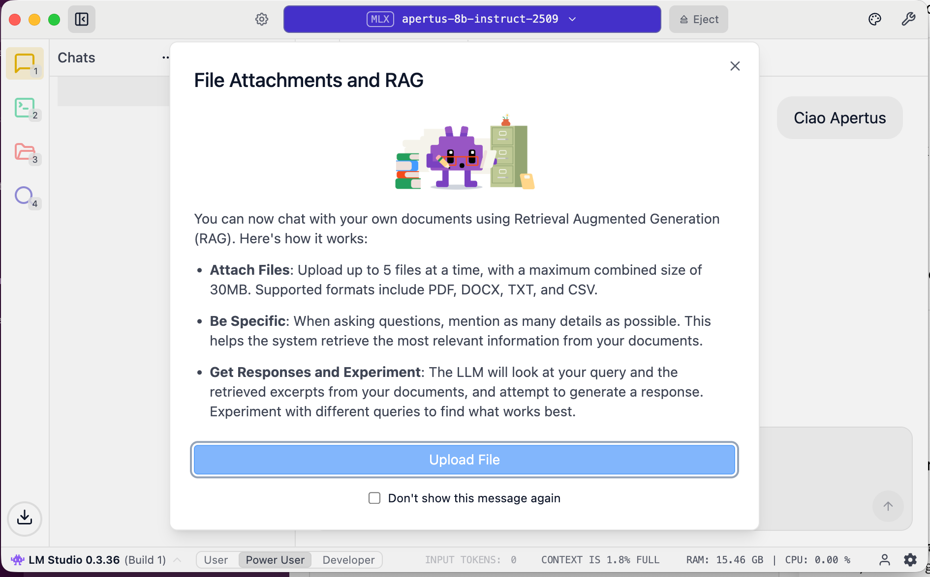 Now you can start chatting, uploading files, heating up the room – all in the privacy of your local GPU. It may not work as quickly or comprehensively as you are used to, but at all times you remain in control of your algorithm.