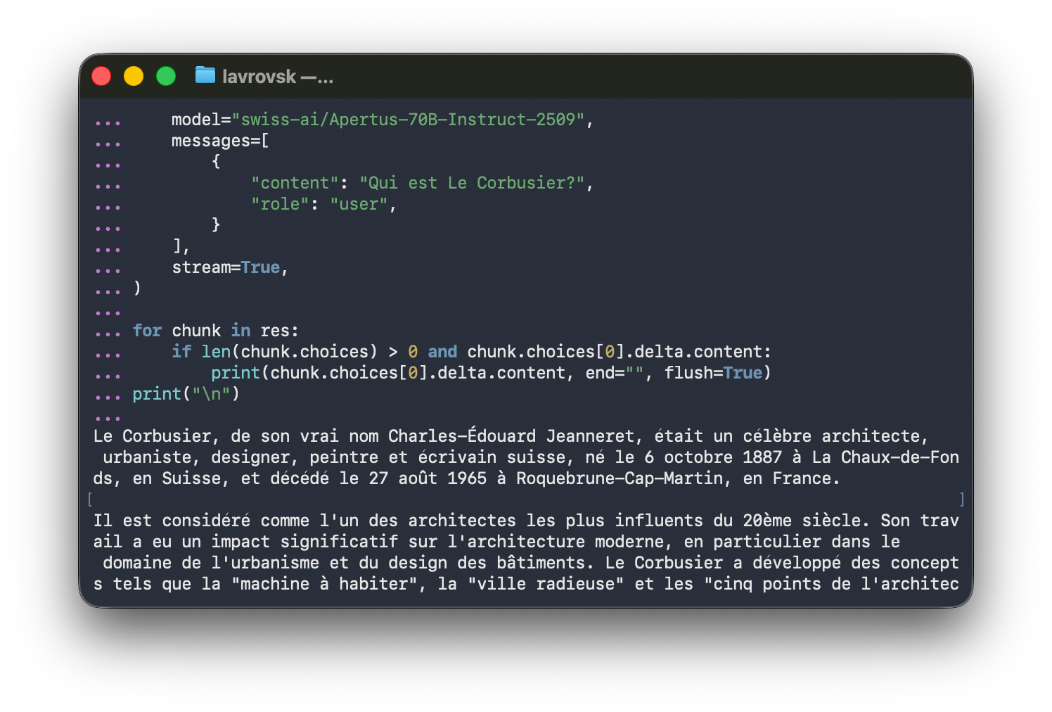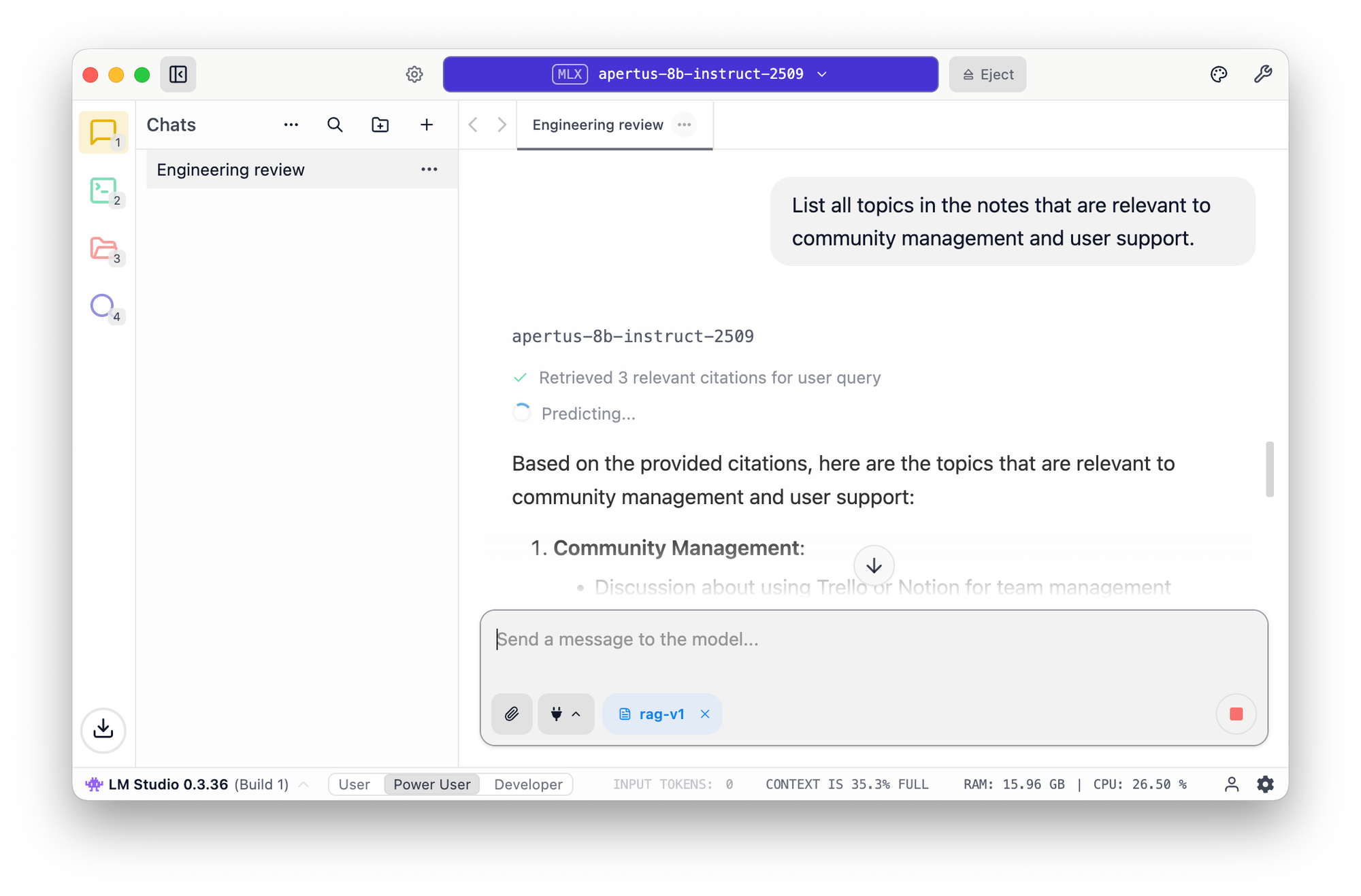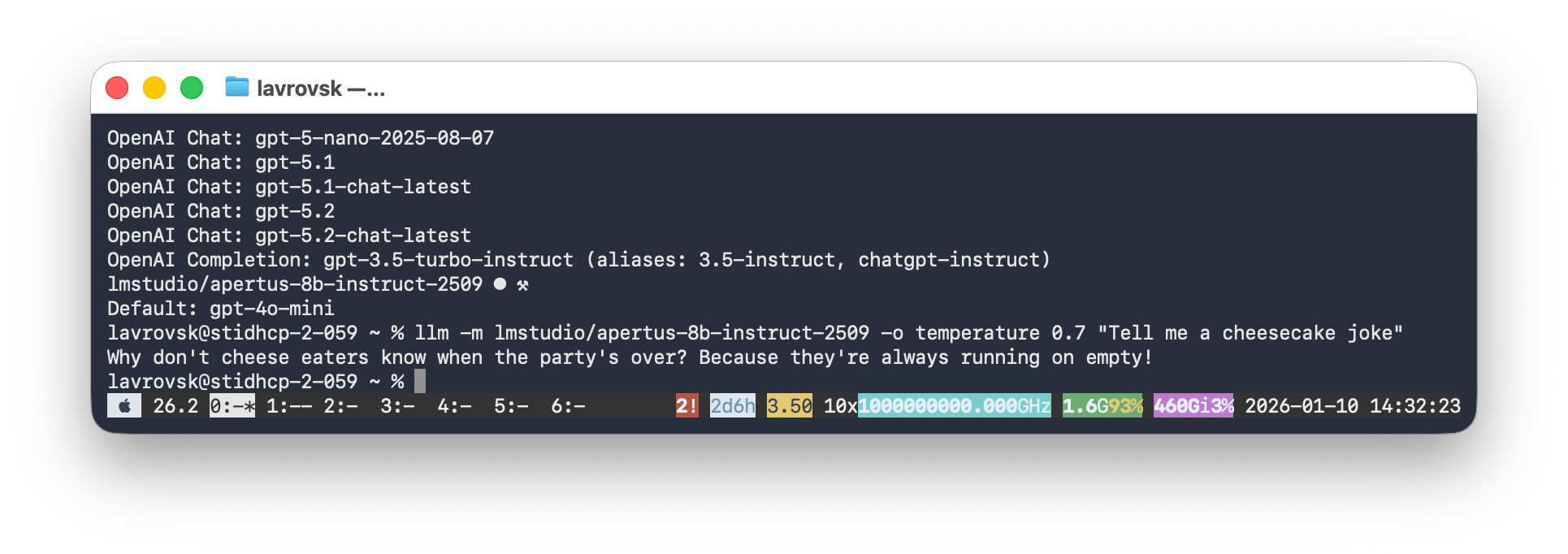 The Local LLM Service makes it possible to chat with Apertus from the LM Studio CLI, which gives me a handy way (--stats option) to test performance. Here you can see that it takes about half a second to first token, and the M4 is pumping out a modest but reasonable 6.46 tokens per second (for comparison, we humans on average read at 5 tokens per second):