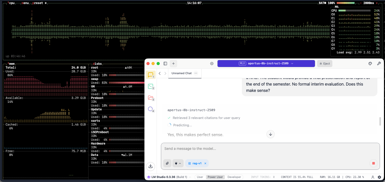 The laptop on my desk has a current M4 chip and 24 GB of RAM (non Pro), currently retailing at under 1500 CHF. The new Macbooks have been widely discussed (along with the Pro and mini M4 editions) as an excellent choice for users and developers. I have seen Apertus running impressively well on a Mac mini, and wondered how much mileage one could get out of a mid-range laptop with around 16 GB memory for loading AI models. The laptop reviewed here is on loan from the AI Center at EPFL, where I've just started work 🎉