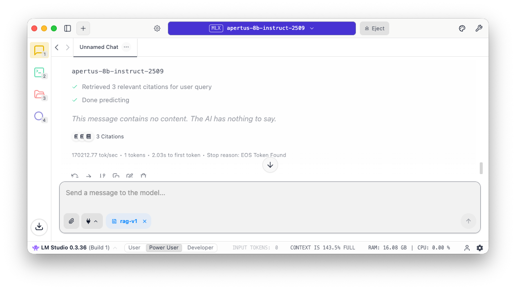 The post describes the process of installing and using Apertus MLX builds on an Apple MacBook. Details the installation of LM Studio, with some basic performance testing, and provides links to more in-depth analysis and further references. If you feel this is all too much, and would just like to use a ready-to-go service online, see my previous post for more direct waypoints:
