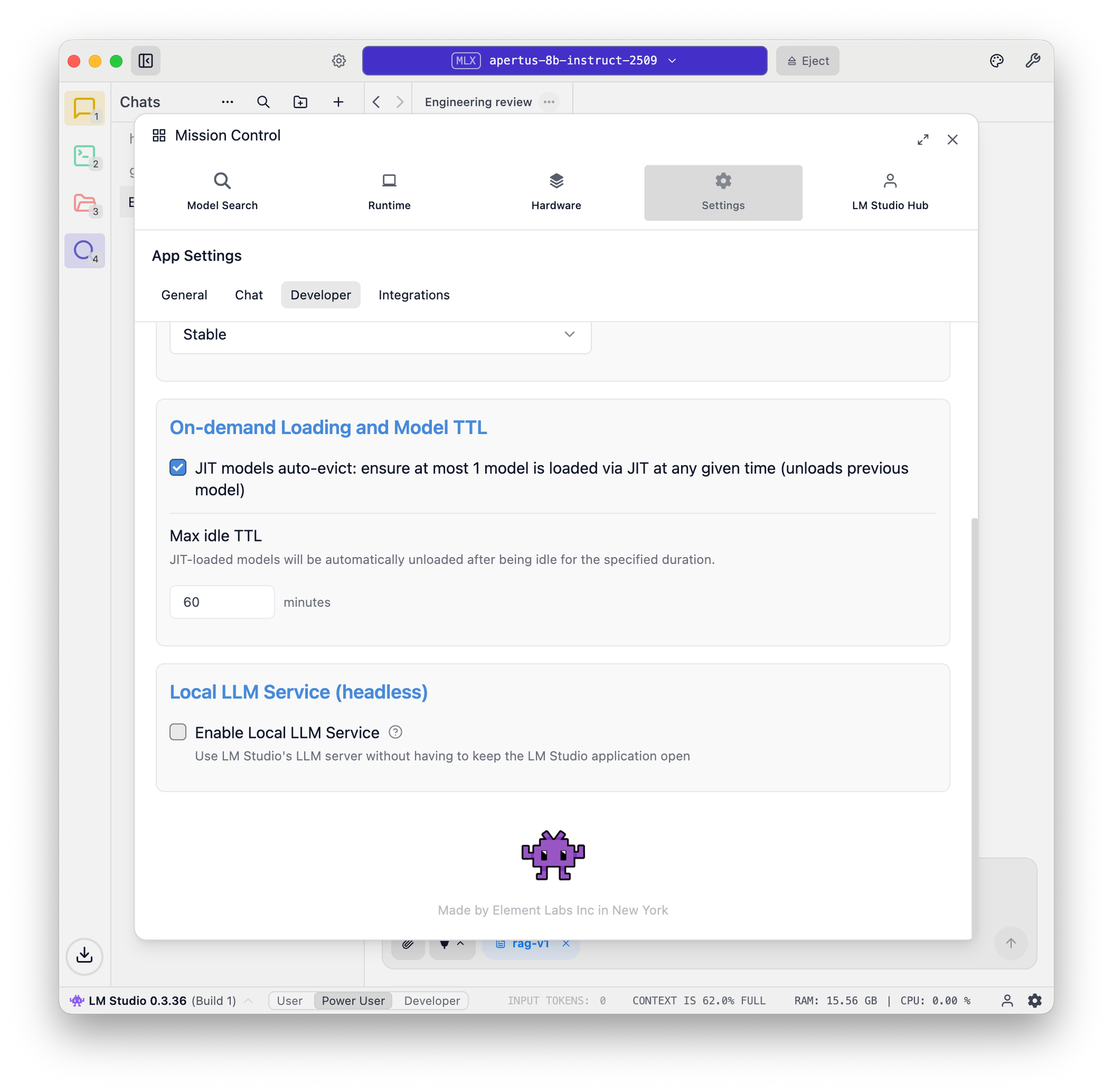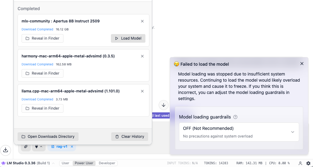 It took about 15 minutes to download the model on a fast connection. When I click on the Load model button in the screenshot below, a "Failed to load the model" dialog cautions me about insufficient system resources. I have disabled this guardrail (set to OFF), and have not yet seen issues with system performance. Watching my memory consumption, LM Studio has not yet used up the available 15 - 20 GB, even with a full context window. This warning is an issue I'll investigate further.