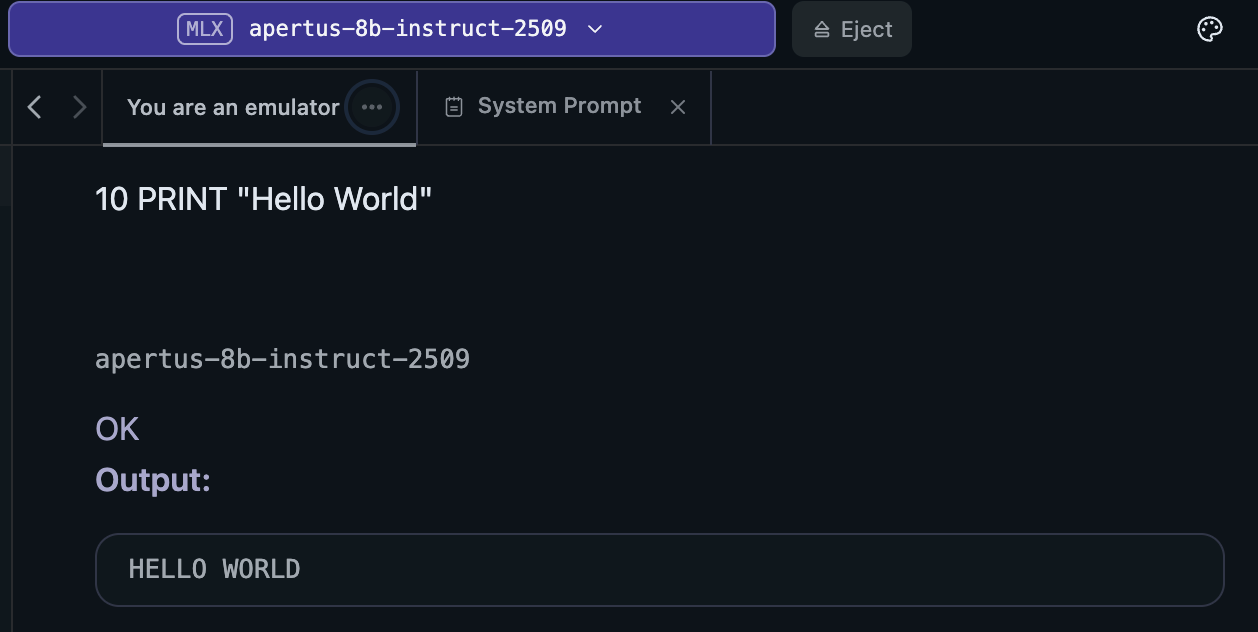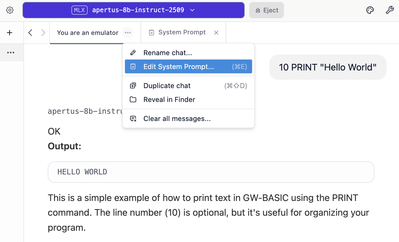 As mentioned in my previous blog post, I grew up with the early Apple machines, so as a fun exercise I decided to teach Apertus the anachronistic language of BASIC. You can do things like this by editing the System Prompt – just option click on your chat window.