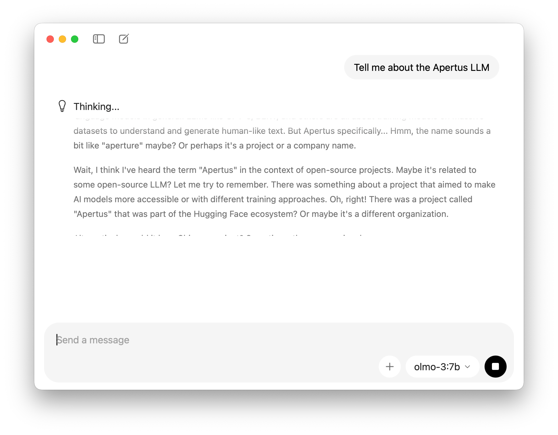 Right now, Apertus can only be loaded in Ollama on the command line from community Hugging Face remixes (GGUF), as described in my earlier blog post: