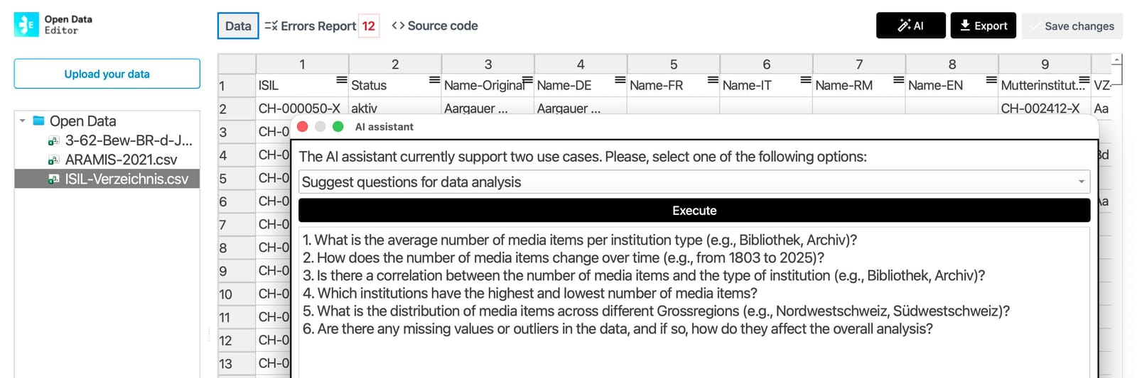 With this screenshot of the Apertus model helping to improve the quality of an Open Government Dataset with the local AI assistant of OKFN's Open Data Editor, I am showing that a big part of this is already available, without fancy proprietary standards, and accessible to a non-technical audience.