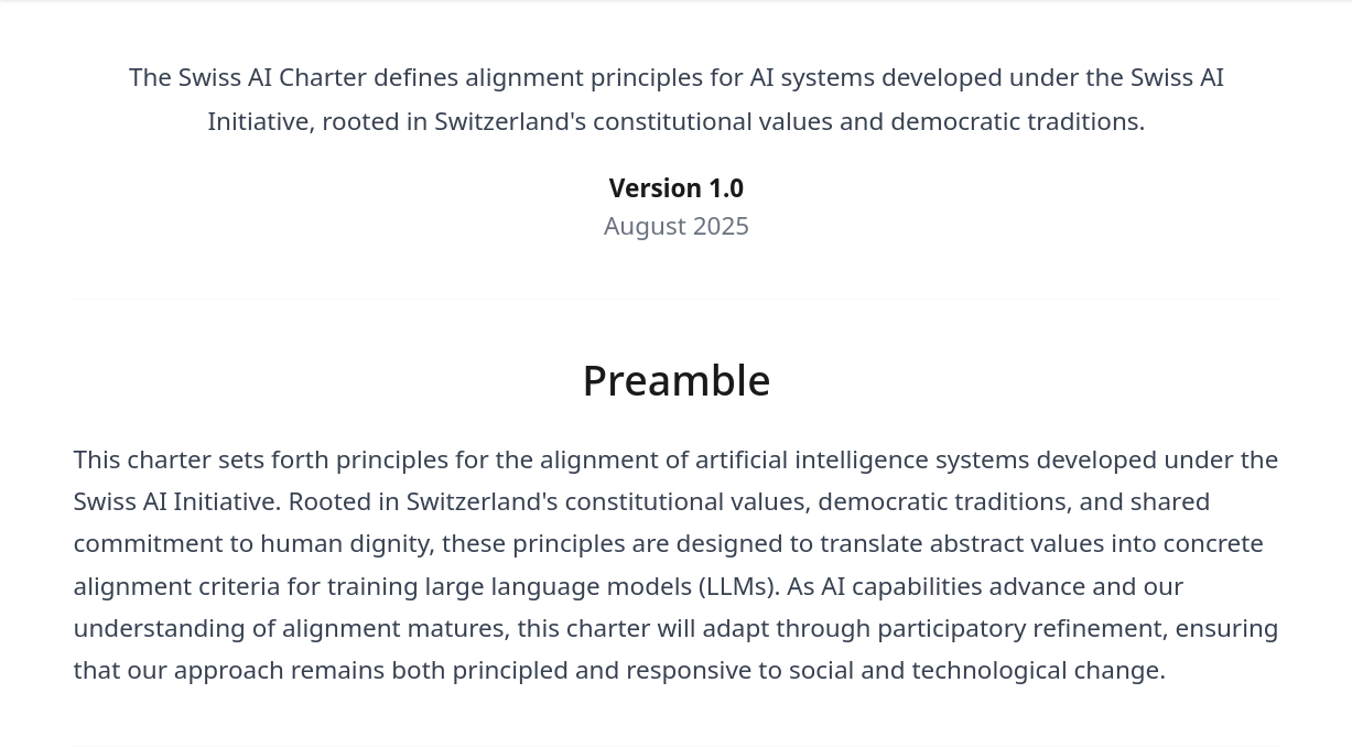 Often missed on page 115 of the Tech Report, this rather short, dense and remarkable document is both a key element of the guardrails of the Apertus model, and a vision of how Swiss AI could serve to become a global foundation. The digital society should take note and contribute to these constitutional efforts, which parallel similar philosophic prompt-engineering efforts around the world.