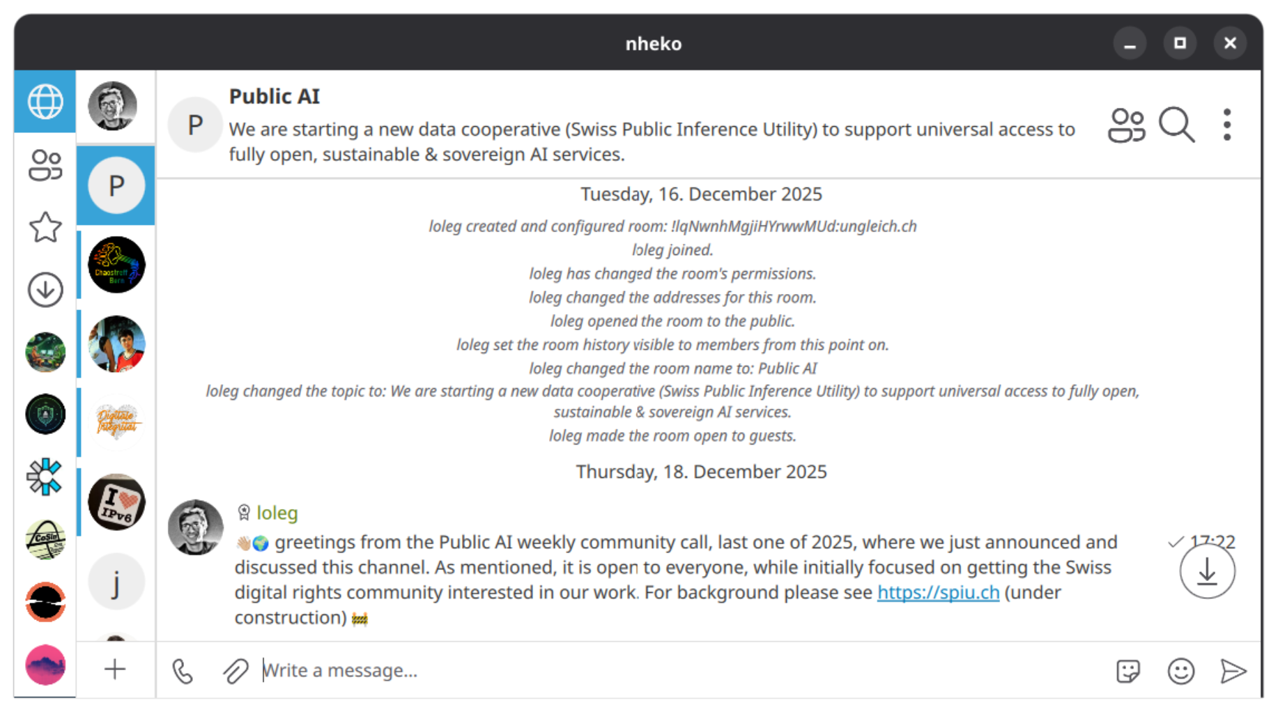 We have a channel, currently rather quiet, but I encourage folks in the Digital Society community (especially those who are understandably allergic to proprietary clouds and chat-clients) to join us here. I also invited the people gathered in front of me to come back in a week for a launch event in Zürich.