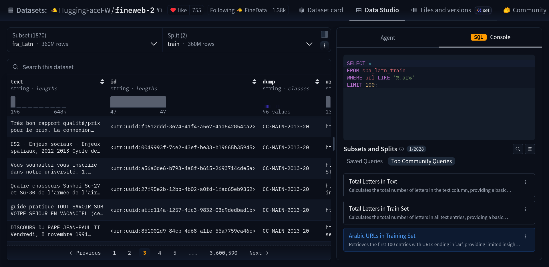 Here is the multi-billion-row dataset being explored directly in the web browser, even with the ability to run SQL to browse the data. This powerful capability can be used to hold AI developers accountable, discover security or bias problems, and contribute to the "data mix" of open models.