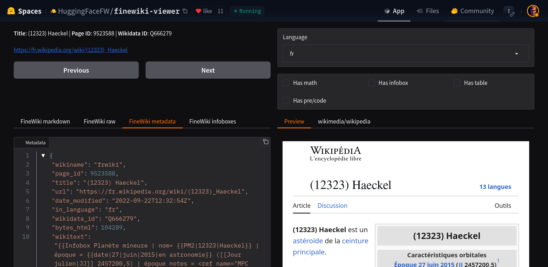 Here you can see how a Wikipedia article is represented in the FineWiki project. A number of such helpful tools exist in the form of Hugging Face Spaces. Some of them go more into the security or performance direction. I have one of my own for testing Apertus, and would be happy to see what you come up with.