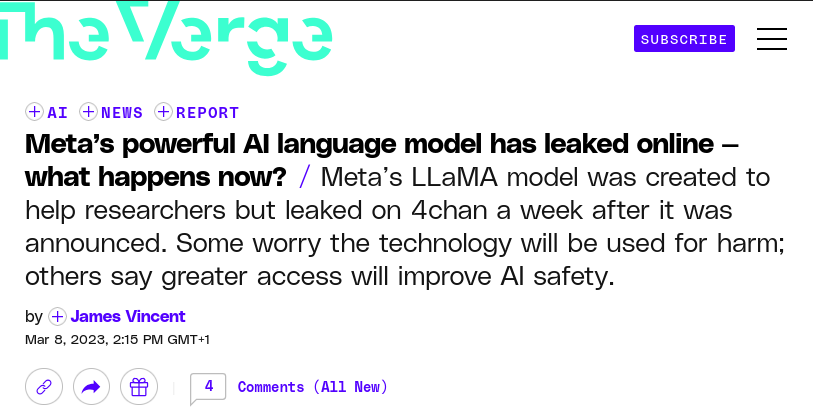 A look back at the now historic leak of the famous LLaMA open weight AI model. A number of risks are invoked that the technology could be used maliciously, with Meta defending its decision to open-source the model as necessary for advancing research, but the leak highlights the difficulty of balancing openness and responsible AI development.