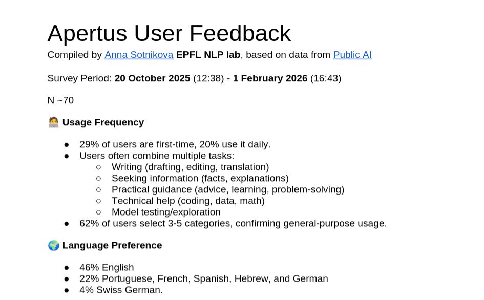 This is a glimpse of a survey by Anna Sotnikova (EPFL NLP lab) that was embedded in the Public AI service, and to which around 70 users have responded. It is a glimpse of the kind of insights we should expect from research collaborations. And one of the easiest ways that we as users can contribute to the science and practice of LLMs.
